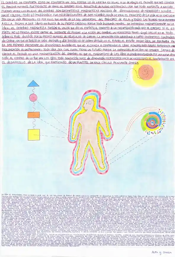 DIVINE TITLE 1971.- THE HUMAN BRAIN HAS 318 SENSITIVITY ZONES, CALLED VIRTUES; THE GENERATED IDEAS REPRESENT ELECTRICAL IMPULSES OF A VALUE OF THREE TRILLIONTHS OF A SOLAR LINE; THE SOLAR LINE IS THE ELECTRICAL CONTENT THAT A PHYSICAL BODY POSSESSES; THE IDEA IS BORN FROM THE BRAIN, AND TRAVELS THROUGH THE PHYSICAL BODY, IN ALPHA LINE; AND DETACHES FROM IT, IN THE FORM OF A WAVE OR OMEGA CIRCLE; IDEAS CONTAIN TWO FORMS OF MAGNETISM: PHYSICAL AND SPIRITUAL; EVERY IDEA IS IMPREGNATED WITHIN ITSELF, ALL THE SCENES THAT THE EYES SAW; AT THE INSTANT OF BIRTH OF AN IDEA, A MAGNETIC IMPULSE IS FORMED IN THE BRAIN AND INSTANTLY, IN WHICH ATMOSPHERE, BLOODSTREAM AND BRAIN CELLS PARTICIPATE; THIS UNION IS CALLED LIVING TRINITY; BETWEEN THE INSTANT OF THE STARTING POINT OF AN IDEA, AND THE INSTANT OF ITS MATERIALIZATION, THERE EXISTS A MICROSCOPIC TIME; IN THIS MICROSCOPIC LAPSE OF TIME, THE ELECTRICITY OF THE BODY GENERATES THROUGH THE BRIGHT LINES OF THE BLOOD, THE FORM OF THE WILL; EXPRESSED IN THINKING GEOMETRY; THINKING GEOMETRY CHOOSES ONE OF THE 318 ZONES OF THE BRAIN; THINKING GEOMETRY RADIATES TOWARDS THE ALL OVER THE ALL; IN ITS RADIATION, THE SPIRIT FEELS A THINKING; EVERY THINKING HAS SPACE, TIME AND PHILOSOPHY; THE INSTANTANEOUS IN THE HUMAN BEING BECOMES EXPANSIVE AND NEVER CEASES TO DO SO; THIS FACT OCCURS ABOVE AND BELOW; THE COLOSSAL WAS BORN FROM THE MICROSCOPIC; THE HUMAN BRAIN REPRESENTS A PROCESS THAT HAS OCCURRED BEFORE THE EARTH EMERGED, FROM THE INVISIBLE TO THE VISIBLE; THE HUMAN BRAIN IS A MICROSCOPIC SUN; IT IS SO SMALL THAT NOT EVEN ITS OWNER SEES ITS OWN BRIGHTNESS; THE BEGINNING OF THE EARTH WAS THE MICROBE; THAT WAS BORN FROM THE FERTILIZATION OF THE ALPHA SUN, BY THE OMEGA SUN; THIS MICROBE STARTED IN THE MACROCOSM, WITH A GEOMETRY THAT HAD AND STILL HAS, A RIGHT ANGLE OF 90°; THIS ANGLE IS THE PATH THAT THE EARTH HAS TAKEN, SINCE IT DETACHED FROM THE SOLAR CROWN, FROM THE OMEGA SUN, FROM THE TRINO GALAXY.-