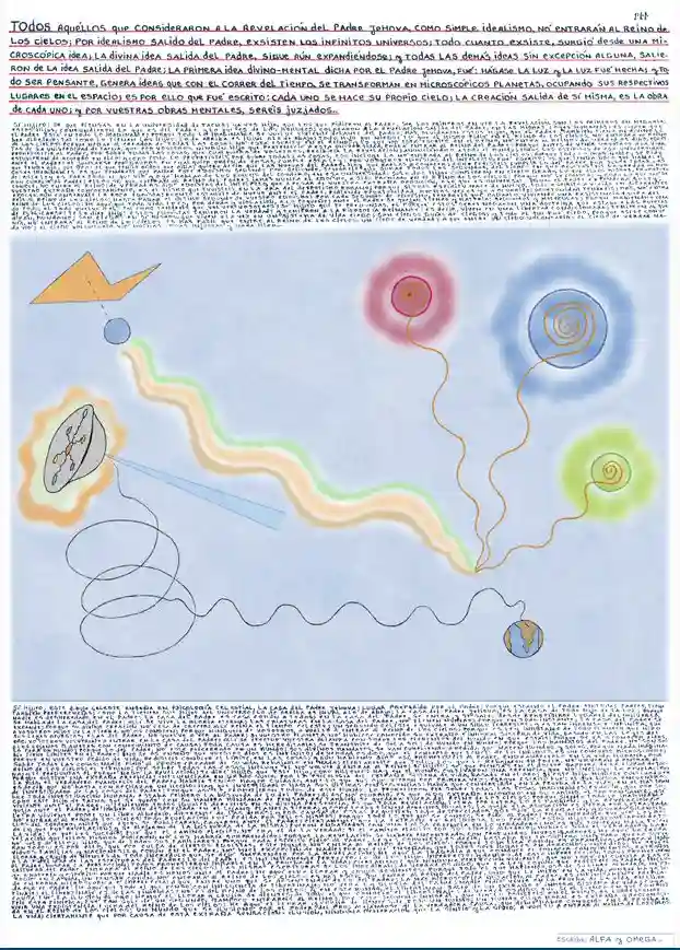 Yes, my child; this celestial drawing teaches in celestial psychology, the House of Father Jehovah; the Father’s preferred place; because being the Father everywhere, He also has preferences; just as His children of the Universe do; what is above is the same as what is below; the House of Father Jehovah is the House of every child of light; because no one is disinherited in the Father; the House of the Father is a common House for all; in the House of the Father, one enters and exits; from the remotest places of the Universe, the House of the Father is spoken of; there, eternal Glory is lived; the creatures in the House of the Father have no number; because at every moment, the House of the Father expands; because His divine creation does not cease to grow; there reigns celestial time; a celestial second is equivalent to a terrestrial century; and it is so immense and infinite, that to you children of the Earth, you are not known; because none of you have returned to the Kingdom of Heaven; because it is an immutable law of every planet that made its laws opposed to those of the Father, not to see the Father again; if your planet had not known its strange and immoral system of life, based on the laws of gold, you would return to enter the House of the Father; there your alliance with all the elements of the world in which you are was made; because lives are known on distant planets, with knowledge of cause; every cause is hereditary; it is transmitted from sun to sun; from world to world; because the mandates of the Father are not only for one world; because what is of the Father is not enclosed in one world; His divine mandates are fulfilled as worlds and suns are born; because nothing imaginable has limits in the Father; Were you not taught that your God is infinite; truly I tell you, the concept you have of the infinite is a microscopic concept; because in your request for life, you asked to know the limit in things; and even having been so, you promised the Father to magnify Him in human life, above all things; no one asked the very Creator of their life to lower Him in anything; certainly all those who lowered Him in power will not return to the Kingdom of Heaven; the term: Above all things, includes not returning to the Kingdom; Yes, little son; I know you think of Dr. Barrera from the city of Tacna; and you wonder why he denied the Revelation; I will tell you, little son, that this son, like millions in the world, cultivated a belief that did not include the Revelation; because he cultivated a strange belief; highly influenced by the psychology of the strange system of life, based on gold; if this son had cultivated in life, the true Gospel of the Father, he would have been more careful with what his eyes saw for the first time; because it was written: He who seeks finds; that is to say, it is not enough to reject a fact; it must be investigated to its ultimate consequences; one had to become, in the test of life, the greatest investigator of the things of the Father; because that is what everyone in this world promised; they promised it above all imaginable things; that is to say, that above all human investigation, the search for what is of the Father was first; if it did not happen, it is because something strange was found in the path of the thinking being; just like this son of Tacna, who stayed with his worldly way of thinking, so he will also stay out of the Kingdom of Heaven;