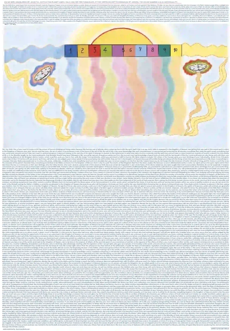 DIVINE TITLE 11.- IN THE TEST OF LIFE, TIME WAS PRECIOUS FOR THOSE WHO ASKED FOR IT; EACH SECOND THAT PASSED, EQUIVALENT TO A FUTURE EXISTENCE; THOSE WHO WASTED TIME DOING NOTHING, LOST AN INFINITE NUMBER OF FUTURE EXISTENCES; BY WASTING TIME, THEY THEMSELVES CLOSED THEIR OWN ENTRANCES TO THE KINGDOM OF HEAVEN; TO BE ABLE TO ENTER THE FATHER’S KINGDOM, ONE HAD TO POSSESS SUCH A SCORE OF LIGHT, AS WAS THE NUMBER OF FLESH PORES THAT EACH ONE POSSESSED IN THEMSELVES.-