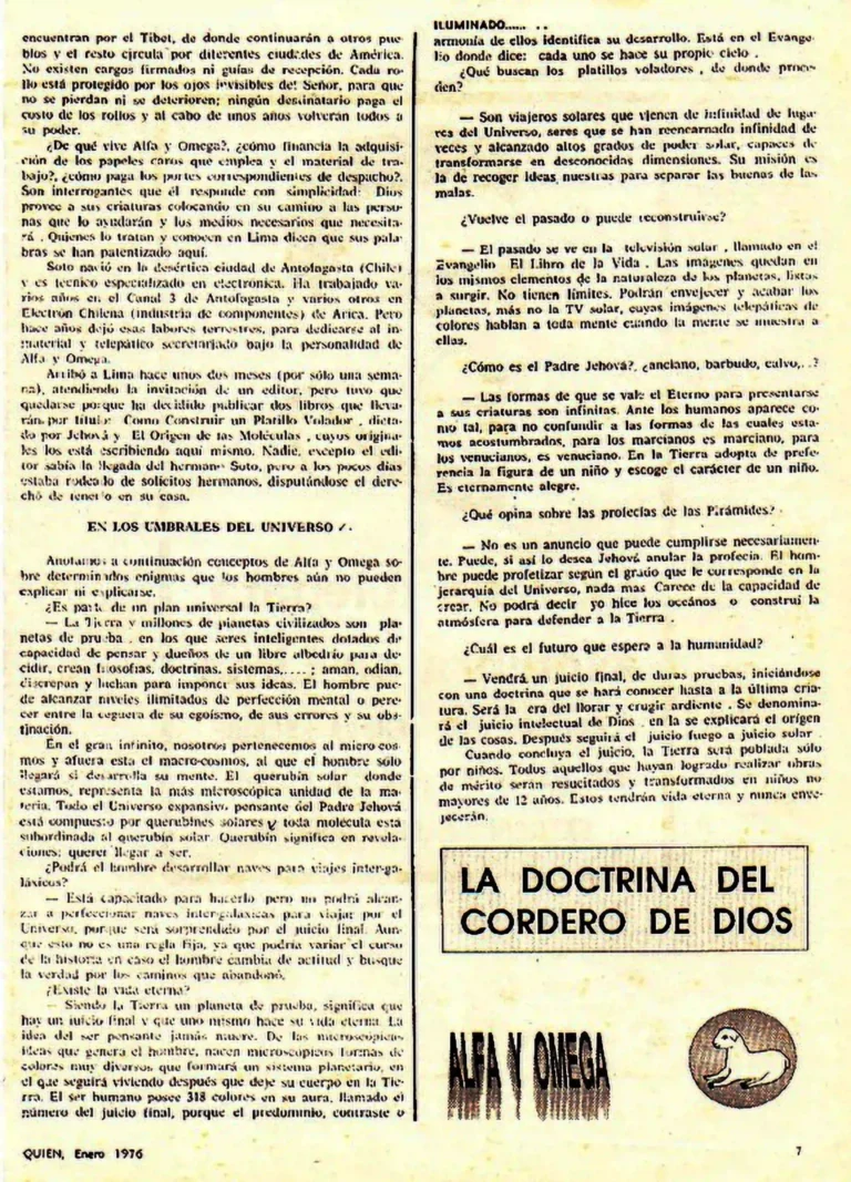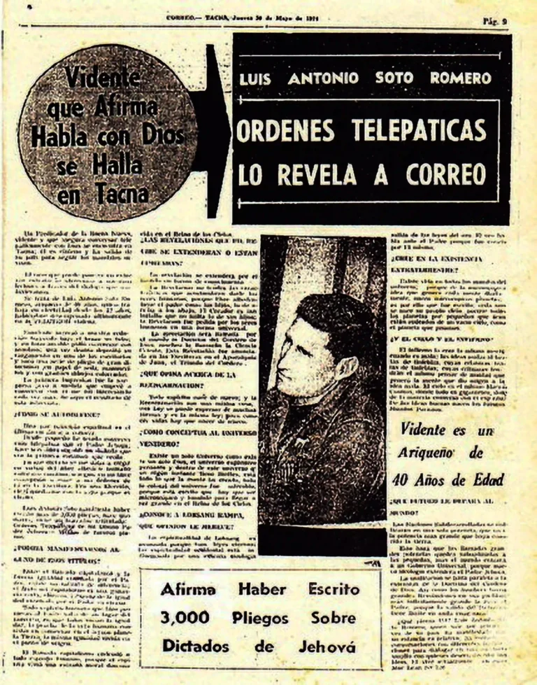 On September 11, 1973, the coup d’état took place in Chile, against the Socialist President Salvador Allende and due to the persecution carried out by the fascist and sinister forces of Pinochet, Luis Soto Romero was forced to leave Chile. In 1974, he left the Chilean flock and entered Peru, and in May of the same year, at the age of 43, he obtained his first journalistic interview in the Correo de Tacna; where he became known as: SEER WHO CLAIMS TO SPEAK WITH GOD IS IN TACNA, LUIS ANTONIO SOTO ROMERO: TELEPATHIC ORDERS REVEAL TO CORREO; CLAIMS TO HAVE WRITTEN 3000 SHEETS ON JEHOVAH’S DICTATIONS, where he explains his experiences and answers some questions.